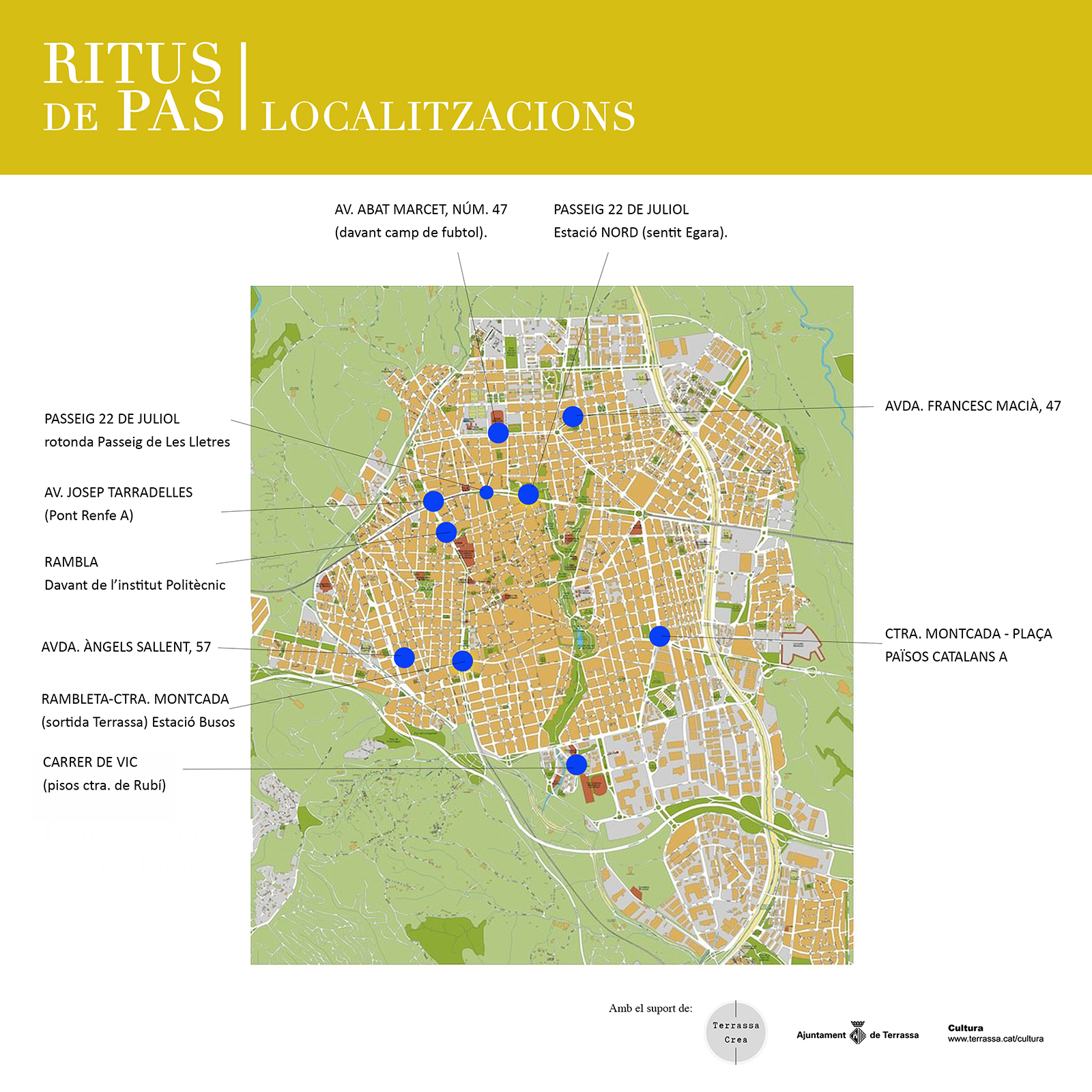 “Ritus de pas” és una travessa per la ciutat de Terrassa. Una trobada amb la natura, la terra i la vellesa. Un viatge que desperta relats i revela imatges històriques. La descoberta d’una mirada sostenible, un passatge efímer pel territori.