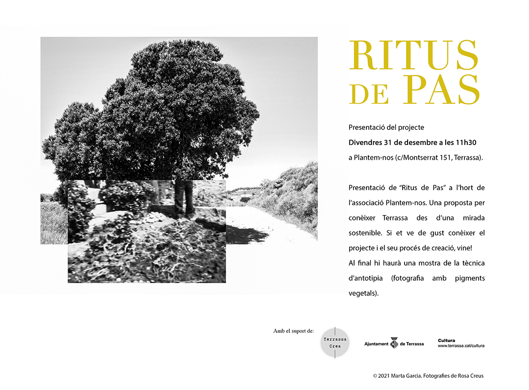 Projecte resultat de la beca TerrassaCrea, Ajuntament de Terrassa, “Ritus de pas” és un proposta de creació col·laborativa amb l’hort Plantem-nos i l’hort d’en Boixac. Gràcies a Rosa Creus, Mariona Bonet, Mariona Gracia, Rosa Bonastre, Josep Mª Albero, Elisa Guillen, Karina Intriago, Imma Bou, Oscar Flechas, Núria Amat, Rosa González, Pablo Lemos, Susana Guarch, Susana Tortosa, Sílvia Banquer, Àngel Folch, Isabel Ubach, Gemma Grifoll i a tots/es els membres de les associacions hortícoles.